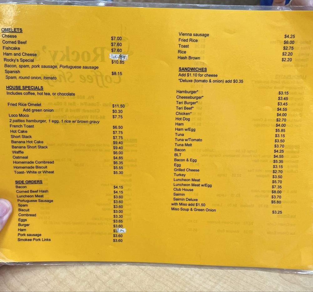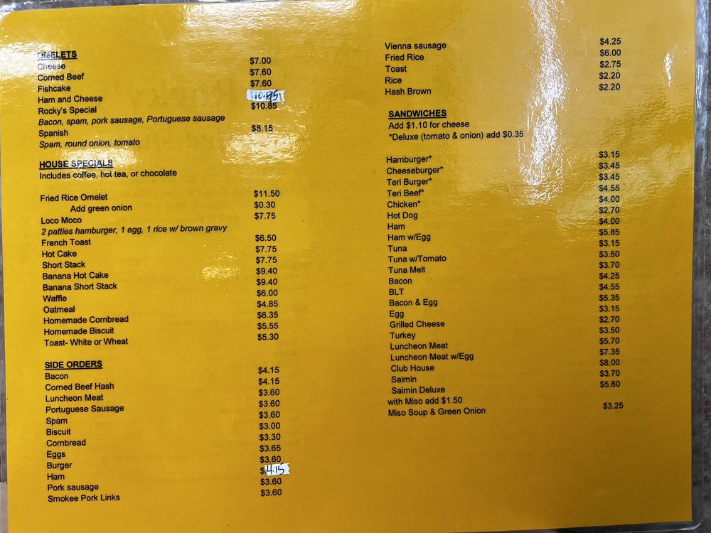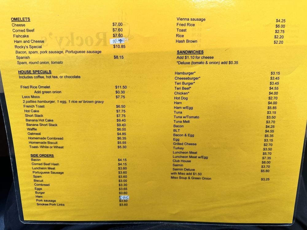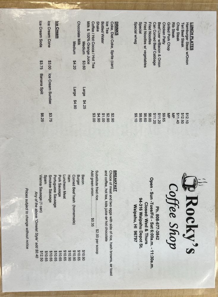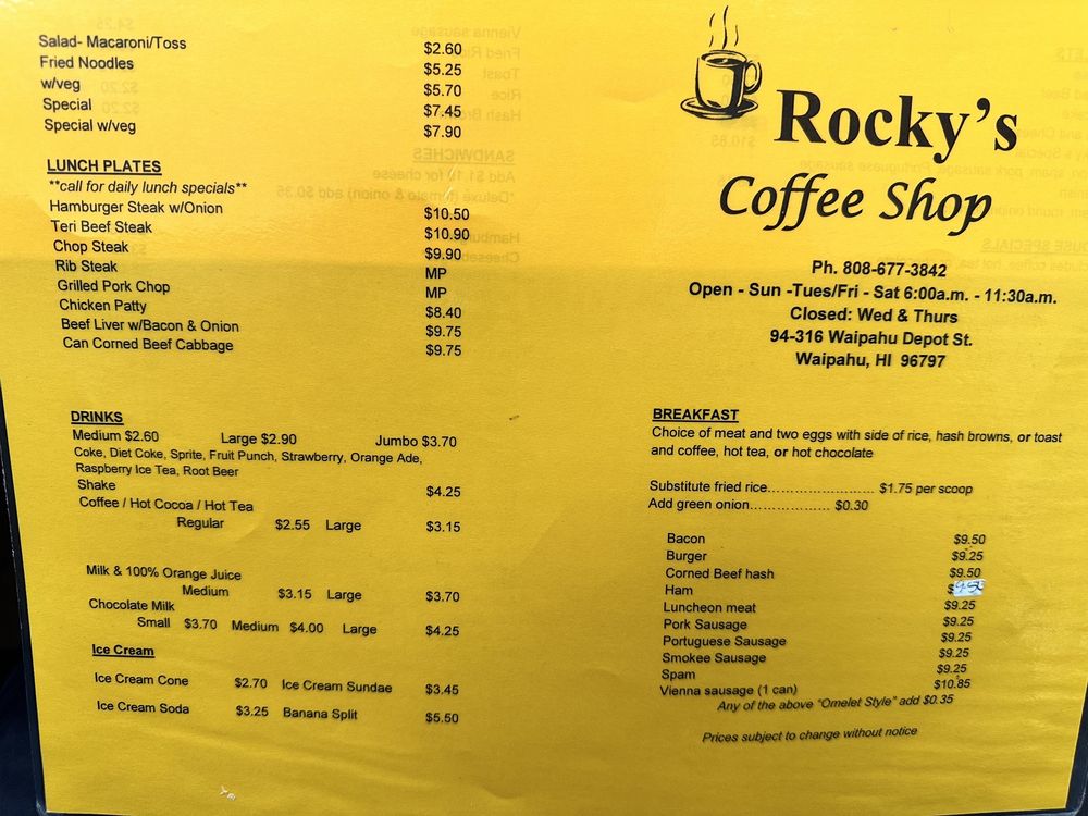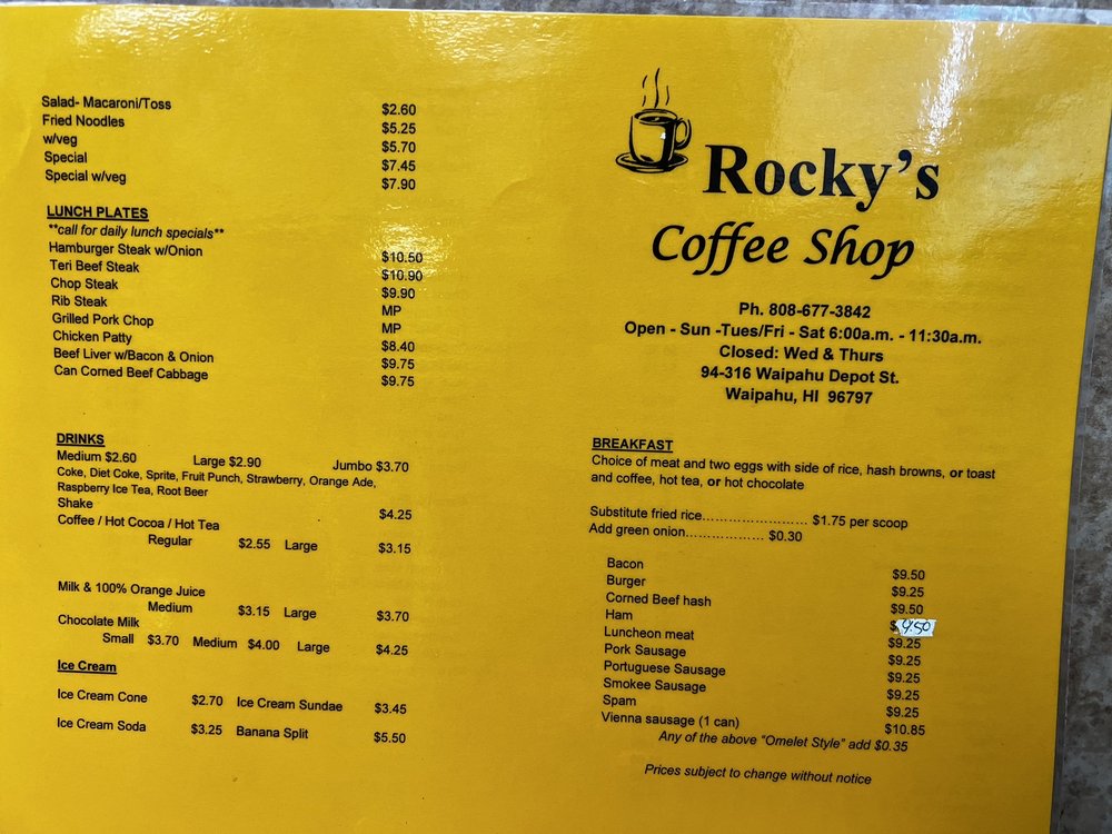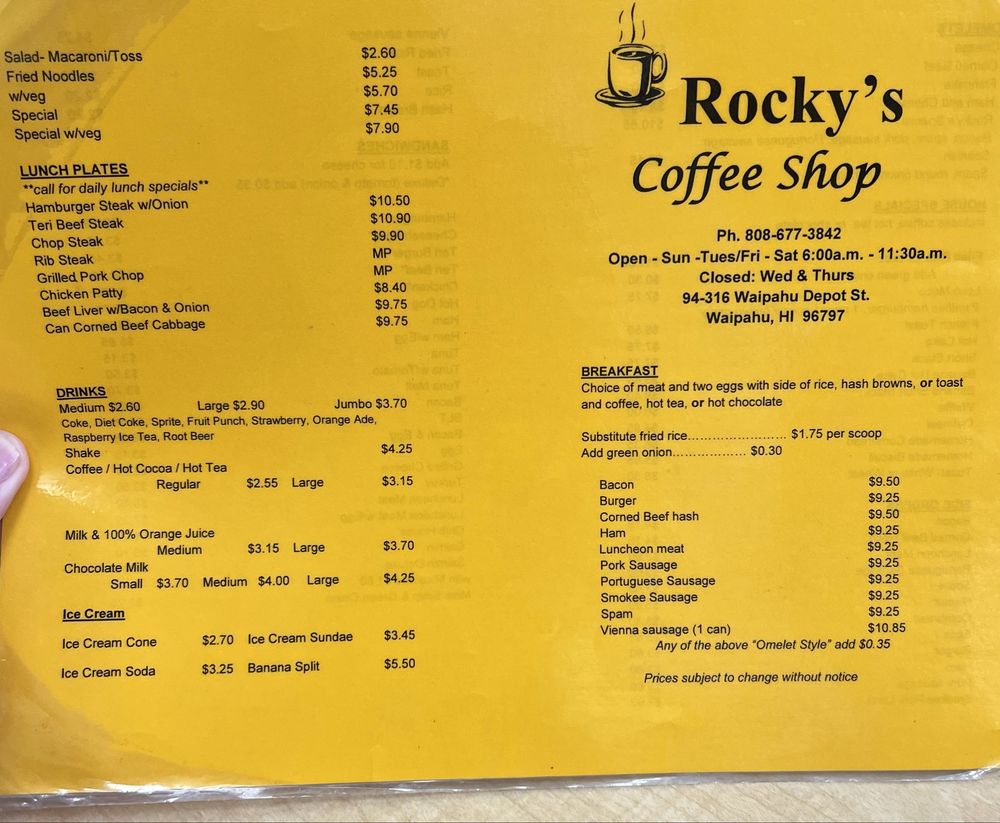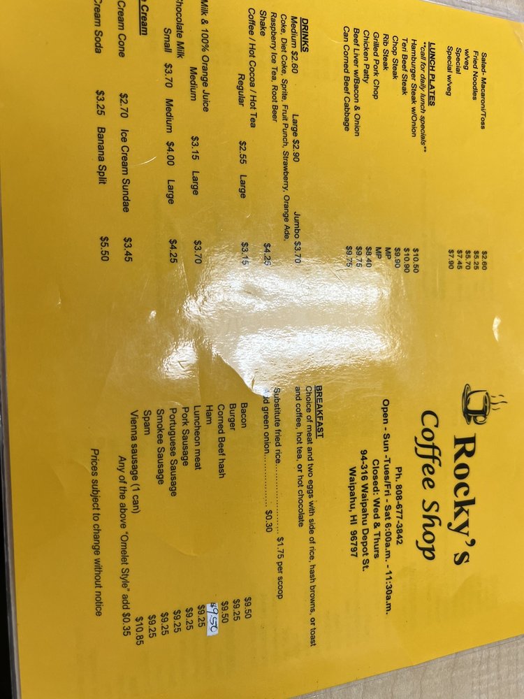 Welcome to Rocky's Coffee Shop, where the essence of breakfast and brunch flourishes. Nestled at 94-316 Waipahu Depot St, Waipahu, HI, this charming diner embodies the spirit of local fare. Offering a cozy atmosphere with a touch of nostalgia, Rocky's is perfect for groups or a quick bite, complete with outdoor seating and free Wi-Fi.